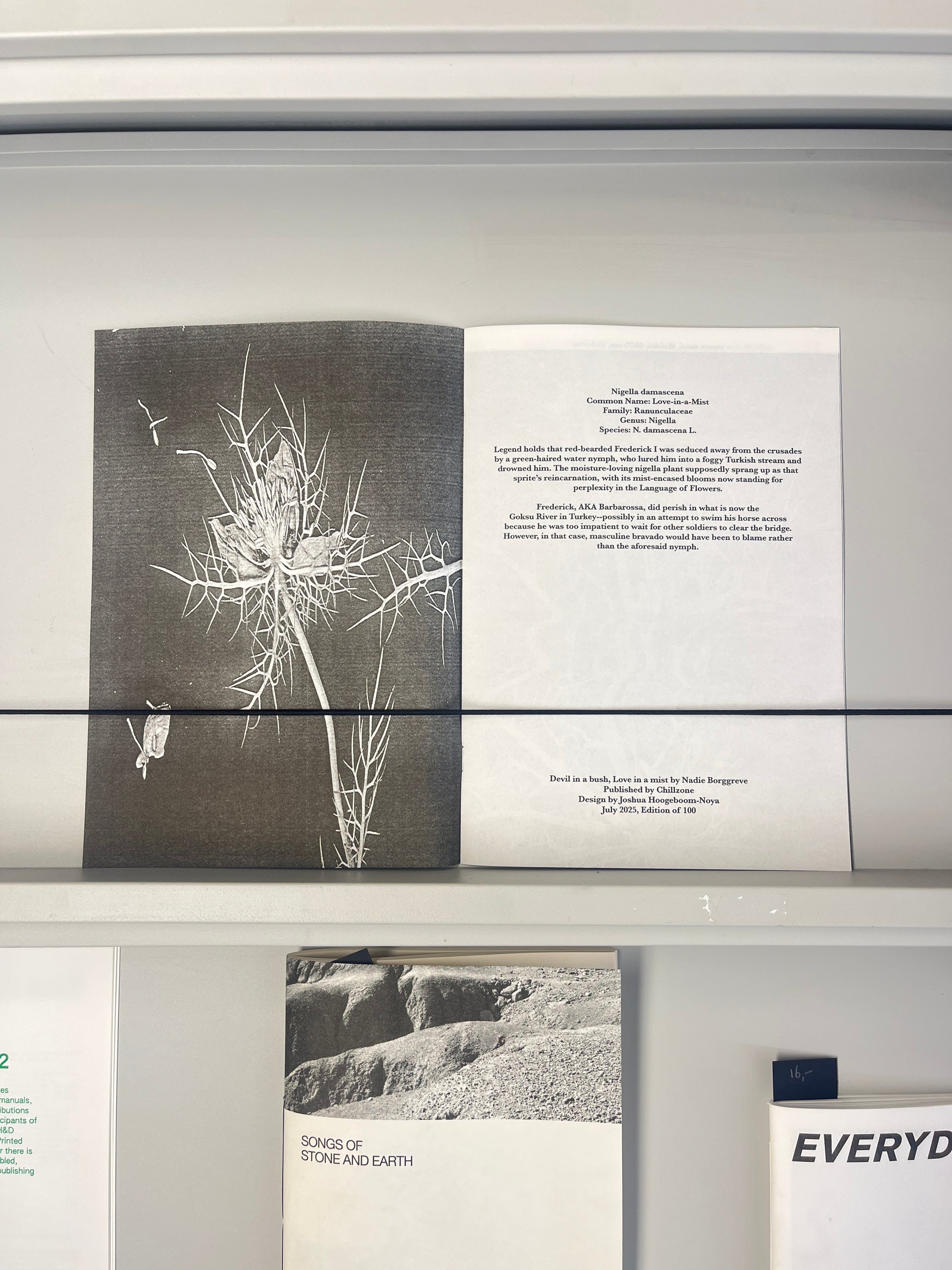 Devil in a Bush, Love in a Mist is a publication and poster produced as a conceptual extension of Nadie Borggreve’s installation, which centers on the flower from which the publication takes its name.