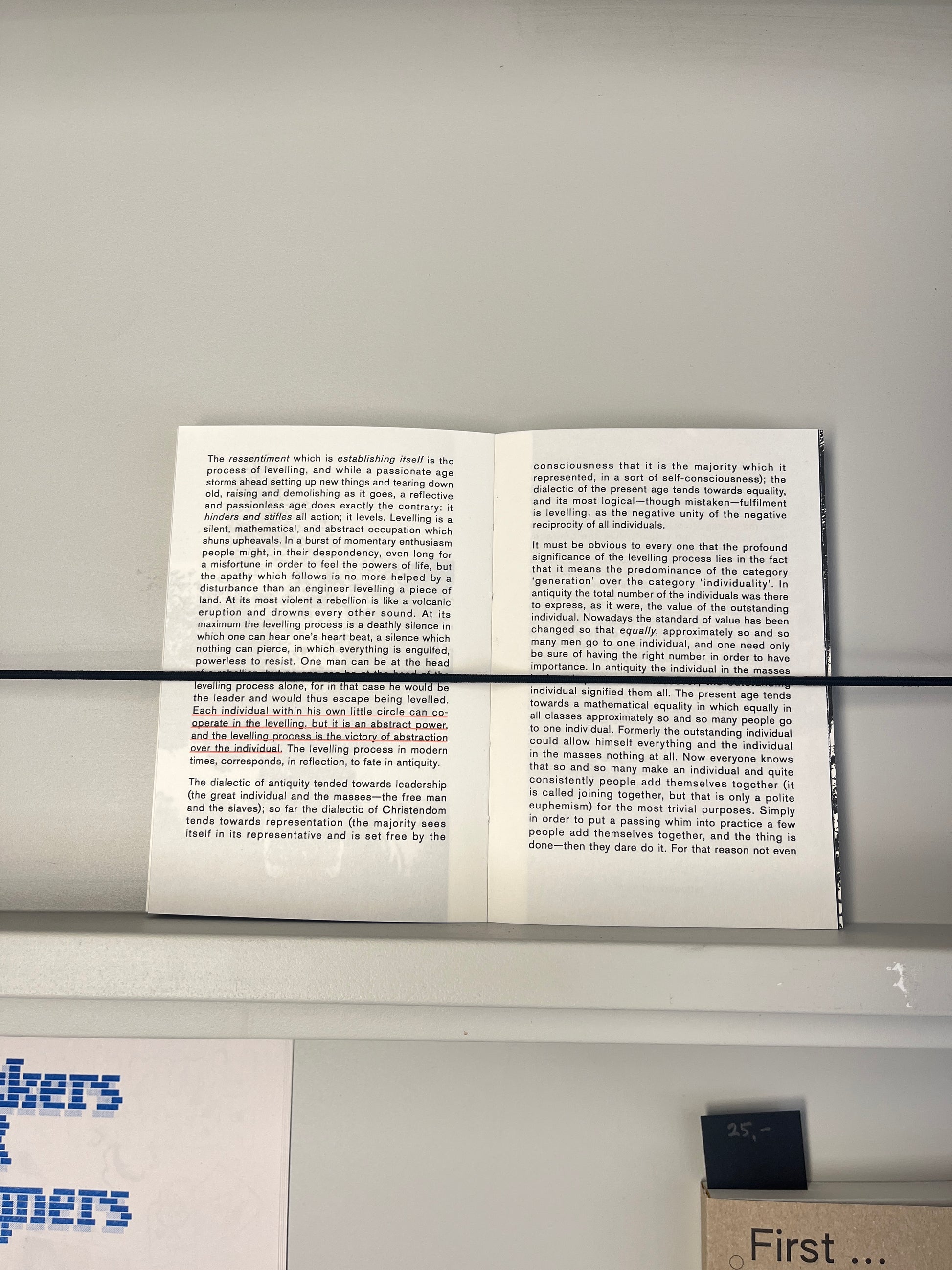 A re-edition of Soren Kierkegaards' essay The Present Age, with the translation by Alexandre Dru — reprinted with the permission of his estate. Though it seems prophetic, it is a reflection on its times — the first half othe 19th century. In response, using as foundation Soviet Montage Theory, a series of stories have been embedded through out the text. These stories were created through instinctual visual reponses while reading the text.